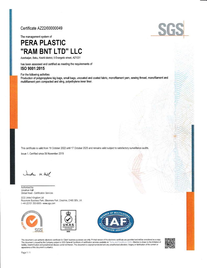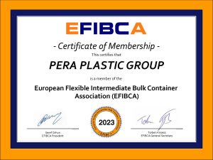 Currently “Pera Plastic” facilities are equipped with advanced technologies and modern equipment (“Starlinger”, Austria), which allows us to monitor production processes and quality of the products confirmed by all the necessary certificates, including certificate of compliance with ISO 9001:2015 “Pera Plastic Group” is a member of European Flexible Intermediate Bulk Container Association (EFIBCA).